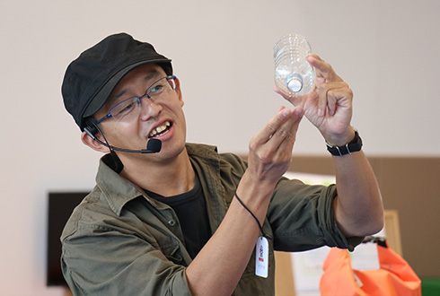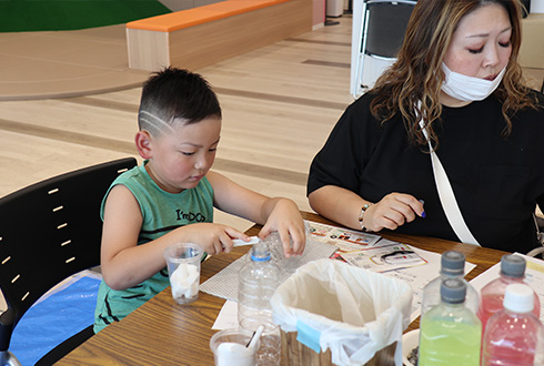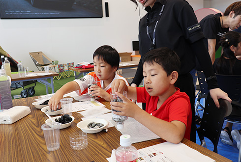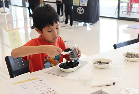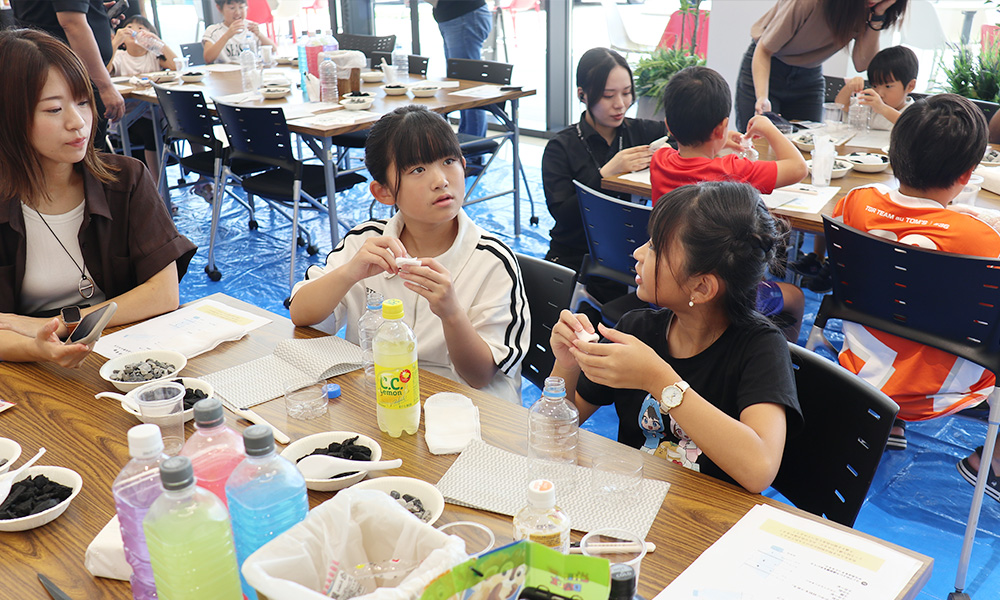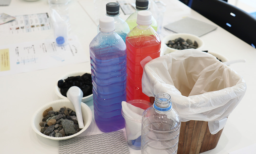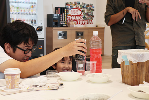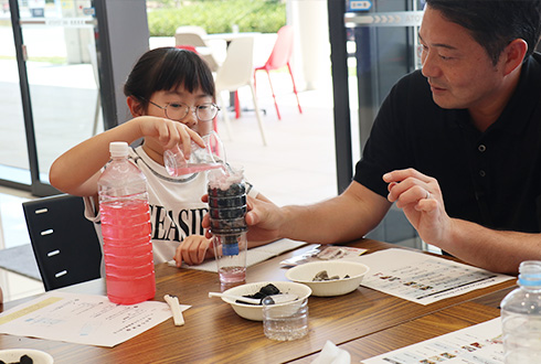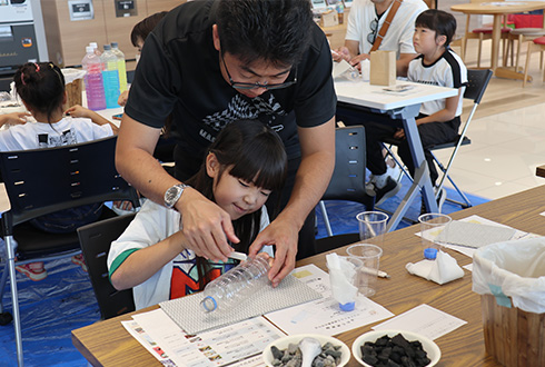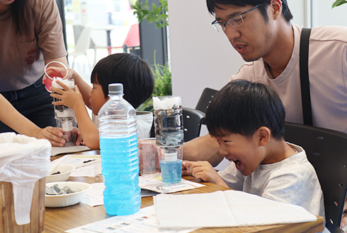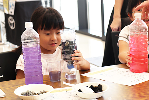 およそ40組の親子が参加。ペットボトルをはじめ身の回りにあるものを使って、子どもたちが自らの手でろ過装置に組み立てていく。そして着色した体をその装置に通すと……「色が変わった!」と歓声が上がる。仕組みが分かると目がキラリ。