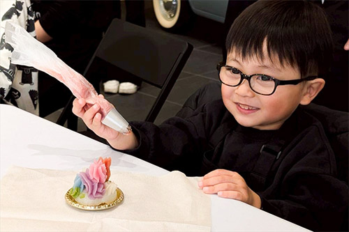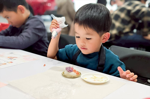 参加した子どもは3部合わせて55人。まずはあんこの歴史について学ぶと、いよいよ花づくりに挑戦だ。餡の入った容器を絞ると、その一押しごとに小さな花弁が増えていく。色彩が帯びていくに連れて、「やった!」「見て見て!」といった喜びの声が飛び交う。