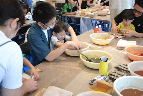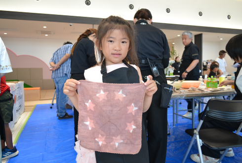 当日は54人が参加。親子で協力しながら取り組み、簡単にできるムラ染めや道具を使った模様付けを楽しんだ。完成したハンカチは一つひとつが個性豊かで、子どもたちは広げて見せながら笑顔を輝かせていた。